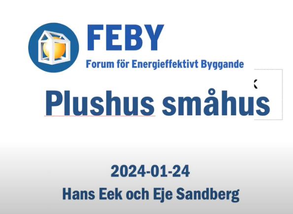 Plushus, frukostutbildning för småhusbyggare (115 min), jan 2024. Hans Eek om byggande på passivhusnivå. Eje Sandberg om den nya FEBY Plushusdefinitionen. Klicka på länk på "Läs mer".